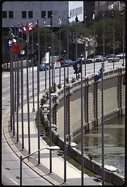 When Columbus was founded, the only planned green spaces downtown were around the Ohio Statehouse and in front of the Carnegie Library. The 1908 Columbus Plan urged the removal of the numerous factories, coal yards, boarding houses, and tenements stretching along the riverfront downtown. The city's prison, storage facilities, and a junk shop were also located on the riverfront there. The plan was not directly adopted, but the Great Flood of 1913 in Columbus destroyed many of these buildings. In 1920, the city pushed for a remade riverfront, though its bond issue did not receive enough public approval.[2] The "Avenue of Flags", flagpoles along Civic Center Drive with each of the 50 state flags, was dedicated on Columbus Day in 1967.[3] The flags were replaced with 25 Ohio flags and 25 Columbus flags in 2002, because of complaints about Confederate symbols on other states' flags.