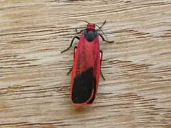 The wingspan is about 25 mm. Adults are half scarlet and half black.[2]
