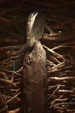 Several sites in Argyll indicate cave burials took place throughout the period. Excavations at Keil cave on the Mull of Kintyre found indications of burials, iron working and Roman pottery with activity taking place over an extended period.[64] A 2008 find of a grave with weaponry at Dunbar also provides some insight into the culture of this period.[65] A similar site at Alloa, adjacent to a Bronze Age burial, has been provisionally dated to between 200 BCE to 200 CE.[66] The Ballachulish figure is a life-sized female figure in alder with quartz pebbles for eyes found under a wicker structure beneath peat at Ballachulish. The high standard of preservation suggests it was deliberately submerged and may indicate the "decommissioning of some form of shrine".[64][63]