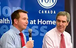 In 2003, following Clark's retirement, Brison ran for the leadership of the Progressive Conservatives[18] on a platform of "new ideas", that consisted of Employment Insurance reform, more private involvement in health care, integrated defence strategy with the US, and socially liberal policies. At the leadership convention, his campaign was dealt a crucial blow by John Herron who defected to the MacKay camp. Despite gaining votes on the second ballot, Brison was eliminated by three votes and threw his support to Jim Prentice.[19] Prentice lost on the final ballot to Peter MacKay (who won with the support of David Orchard). During this time he fought publicly with other members of his party, particularly Elsie Wayne, over their opposition to same-sex marriage.[20] Brison was highly critical of Larry Spencer's suggestion in an interview with The Vancouver Sun that gay sex should be criminalized, saying "statements like this have the potential to stigmatize the new party, so it's important that we denounce those statements strongly."[21]