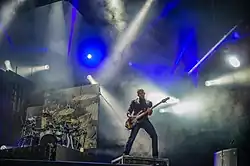 Linkin Park performed at Download Festival on June 14, 2014, where they played their debut album, Hybrid Theory, in its entirety.[166][167][168] Linkin Park headlined Rock am Ring and Rock im Park in 2014, along with Metallica, Kings of Leon, and Iron Maiden.[169][170] They also headlined with Iron Maiden again at the Greenfield Festival in July.[171] On June 22, Linkin Park made an unscheduled headline appearance at the Vans Warped Tour, where they played with members of Issues, the Devil Wears Prada, A Day To Remember, Yellowcard, Breathe Carolina, Finch, and Machine Gun Kelly.[172] In January 2015, the band embarked on a tour to promote the release of The Hunting Party, consisting of 17 concerts across the United States and Canada. The tour was canceled after only three concerts when Bennington injured his ankle.[173][174][175] On May 9, Linkin Park performed at the first edition of Rock in Rio USA, in direct support for Metallica.[176][177]