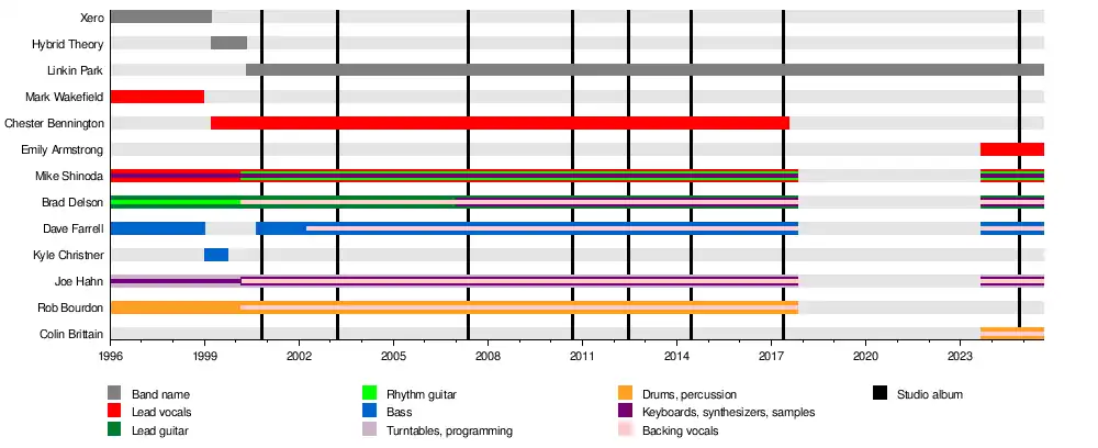 Linkin Park is an American rock band formed in Agoura Hills, California, in 1996. The band's current lineup consists of vocalist/rhythm guitarist/keyboardist Mike Shinoda, lead guitarist Brad Delson, DJ/turntablist Joe Hahn, bassist Dave Farrell, vocalist Emily Armstrong, and drummer Colin Brittain. The lineup for the band's first seven studio albums included lead vocalist Chester Bennington and drummer Rob Bourdon; after Bennington's death in July 2017, the band endured a seven-year hiatus, during which Bourdon chose to depart from the band. In September 2024, Linkin Park's reformation was announced along with the addition of Armstrong and Brittain.