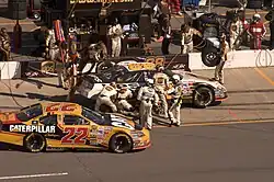 At the end of the season, Wimmer was named the full-time driver for 2004 in the No. 22 Caterpillar Dodge. Before the 2004 season, he was arrested in High Point, North Carolina for driving while intoxicated. He was later convicted and sentenced to probation and 24-hour community service. He began the year with a very strong performance at the Daytona 500, and appeared in contention to win after the final set of pit stops, but without drafting help, Wimmer was easily overtaken by Dale Earnhardt Jr. and Tony Stewart, and ended up finishing third. After this, despite leading laps at a number of other races, Wimmer only had one other top-ten at Dover and finished 27th in points, due in part for failing to qualify for one race. The Davis team struggled in 2004; the Cup operation was reduced to only one car and the season was plagued with a lawsuit from Dodge.[3] He ran the full season again in 2005, but did not finish higher than eleventh in a race that season. He was dismissed from Bill Davis Racing by mail at the end of the season after only managing to squander up a 32nd in the point standings. The nature of his firing later led to a lawsuit against Bill Davis Racing.[4]