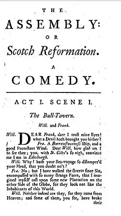 The loss of a royal court also meant there was no force to counter the kirk's dislike of theatre, which struggled to survive in Scotland.[42] However, it was not entirely extinguished. The kirk used theatre for its own purposes in schools and was slow to suppress popular folk dramas.[37] Surviving plays for the period include William Alexander's Monarchicke Tragedies, written just before his departure with the king for England in 1603. They were closet dramas, designed to be read rather than performed, and already indicate Alexander's preference for southern English over the Scots language.[39] There were some attempts to revive Scottish drama. In 1663 Edinburgh lawyer William Clerke wrote Marciano or the Discovery, a play about the restoration of a legitimate dynasty in Florence after many years of civil war. It was performed at the Tennis-Court Theatre at Holyrood Palace before the parliamentary high commissioner John Leslie, Earl of Rothes.[52] Thomas Sydsurf's Tarugo's Wiles or the Coffee House, was first performed in London in 1667 and then in Edinburgh the year after and drew on Spanish comedy.[53] A relative of Sydsurf, physician Archibald Pitcairne (1652–1713) wrote The Assembly or Scotch Reformation (1692), a ribald satire on the morals of the Presbyterian kirk, circulating in manuscript, but not published until 1722, helping to secure the association between Jacobitism and professional drama that discouraged the creation of professional theatre.[54]