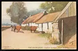 - Similar to a blackhouse or longhouse, constructed of stone walls, but the crofter's cottage differed from the blackhouse in that the animals were not housed inside. Traditional crofters' cottages were very crude constructions - two stone walls filled with earth for insulation, the roof was of thatch or turf and stone slabs were set into the middle of the room for a peat fire which provided some form of central heating. From the 18th century, thatched roofs were gradually replaced with clean timber covered with canvas sails which were treated annually with coat of coal tar.[5] Lime-washed exterior walls were used extensively from the 19th-century. In the early 20th century, a government sponsored initiative sought to improve the standard of housing and crofters were given grants or low-interest loans to bring their houses up to tolerable standards.[6] More than 17,000 crofts can still be found in Scotland.[7]