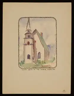 In 1945, Ames wrote a short memoir about Marsden Hartley. Set in the period at the end of his life when he lived in the home of a Maine lobsterman and his wife, it was written as if through the eyes of the wife, Katie Young, a long-term resident whose foreign birth set her apart from the other inhabitants of the tiny village of Corea, Maine. Ames had met Katie and her husband Forrest when she visited Hartley in the chicken-coop studio the Youngs had lent him.[49] After writing it, she kept the typed manuscript among her possessions until 1959 when she donated it to the Smithsonian Archives of American Art. The University of Maine press published the manuscript in 1972 as Marsden Hartley in Maine. The book was edited by Richard S. Sprague, an English professor at the university who was also responsible for acquiring the typescript and arranging for publication. The book had a foreword by the art critic and historian Elizabeth McCausland and an afterword by Carl Sprinchorn, a Swedish-American artist known for paintings made in the North Maine Woods. Ames illustrated the work with line drawings and watercolors. One reviewer said the book was "not really about Hartley at all, though he is certainly a part of the tale. The book is really about friendship, about living and dying, and about how we respond to the death of a loved one.[50] Another reviewer wrote that "Miss Ames's prose is rarely pretentious, and it has always a pleasant flavor of her artist's eye as she sets the scene for Katie's own story. The drawings and watercolors are likewise simple, appropriately reflecting both the homeliness of Hartley's final residence and the sense of absence without him."[51] A watercolor of the church in Correa, shown above at right, is one of the book's illustrations.