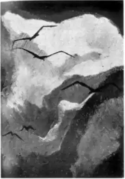 During the late 1950s, Ames continued to participate in group exhibitions in Chicago, including ones at the Art Institute (1957 and 1959), the Arts Club (1958 and 1959), and Cromer & Quint (1959).[17][35] The 1958 Arts Club show included a painting, "Dark Birds", which one critic called "powerful, richly toned" and which was reproduced in an article on Ames in the University of Chicago Magazine later that year.[30][35] A reproduction of this image is shown above, no. 4.