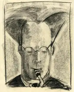 Ames participated in group exhibitions during the 1940s, including appearances at a new gallery called "Number 10" and at a gallery in the clubhouse of the American Women's Association in New York, both in 1940.[13][14] She participated in a members' exhibition at the American British Art Center, a group show at New York's Puma Gallery, and a show at a gallery run by the Friends of Greece, all in 1943.[15][16][17] A review of the Puma show in Art Digest mentions Ames's portrait of a then-popular orchestral saxophone soloist, Sigurd Rasher, and Art News subsequently printed an image of the painting.[11][18] Howard Devree of the New York Times also called attention to the portrait, calling its subject a "flaming saxophonist".[19] A sketch for this painting is shown above, no. 3.