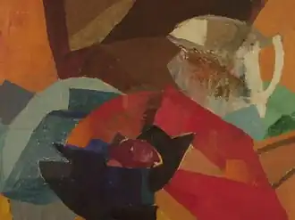 Ames showed a still life in the annual Society of Independent Artists exhibition of 1935. Noting that her painting was "interesting and promising", a critic praised its "especially notable" use of color.[6] The review did not name the painting. "Still Life #2"", shown above, no. 1, is an example of her still life work at the time. The next year, a critic for Art News called attention to a painting of hers called "The Gift" at a Salons of America exhibition, saying it ranked "as one of the more notable pictures" in that large and diverse show. In addition to the critic's review, the magazine included an image of the painting (shown above, no. 2).[7]