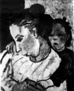 Ames was both painter and sculptor. Her sculptures were mainly in carved wood and sometimes in cast bronze.[10][40] Her painted subjects included landscapes,[10] still lifes,[6] and both semi- and pure abstractions.[33][41] She was best known for her portraits, particularly ones having children as subjects as well as prominent men and women in the performing arts.[2] Many, perhaps most, of the portraits were commissioned. Of those having children as subjects, the best-known shows the two children of Mr. and Mrs. Lloyd W. Powers Jr. seated at the piano.[2] The best known of her celebrity portraits include concert saxophonist, Sigurd Rasher; opera singer, Povla Frijsh; classical composer, Paul Nordoff; actor, Geraldine Page; and fashion model Marion Morehouse.[18][34][40] A reviewer once said Ames did not aim for realism in her portraits believing that "the painting of a human being has the same approach as a landscape or still life—it is the movement created through the color that is more important than the subject."[28]