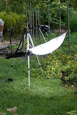 A scrim can also be a translucent gauze type material that may be fastened onto a frame, and used outdoors to reduce the intensity of, and soften harsh light on subjects/people being filmed or photographed. They are available in a multitude of shapes and sizes, either small enough to be held in one hand by a photographer or assistant, up to almost tent like contraptions.