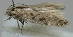 The wingspan is 12–14 mm (0.47–0.55 in).[4] Terminal joint of palpi as long as second. Forewings pale greyish-ochreous, sprinkled with dark fuscous and ochreous-whitish; stigmata dark fuscous, first discal rather beyond plical; a dark fuscous spot close beyond and slightly beneath second discal, sometimes confluent with it; an indistinct fine pale angulated fascia at 3/4, sometimes obsolete. Hindwings 1, whitish-grey, terminally darker. The larva is pale yellowish-green; dorsal line reddish; sides sometimes rosy-tinged; dots blackish-grey; head pale brownish-ochreous; plate of 2 blackish-brown.[5][6][7][8]