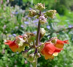 Scrophularia sambucifolia is a perennial rhizomatous glabrous herb with stems up to 1.90 m (6.2 ft) tall with little or no ramification. Inflorescence is usually 15–50 cm (5.9–19.7 in) long with 1 to 10 opposed flowers. Flower crown is orange-reddish, orange-purple or greenish-yellow with orange spots, upper lip is reddish purple. Anthers are yellow, sometimes with bluish margins. Staminode is purple, sometimes greenish-purple.[2]