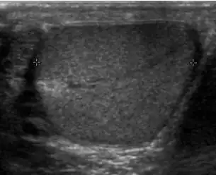 Patients with testicular lymphoma are usually old aged around 60 years of age, present with painless testicular enlargement and less commonly with other systemic symptoms such as weight loss, anorexia, fever and weakness. Bilateral testicle involvements are common and occur in 8.5% to 18% of cases. At sonography, most lymphomas are homogeneous and diffusely replace the testis [Fig. 7]. However focal hypoechoic lesions can occur, hemorrhage and necrosis are rare. At times, the sonographic appearance of lymphoma is indistinguishable from that of the germ cell tumors [Fig. 8], then the patient's age at presentation, symptoms, and medical history, as well as multiplicity and bilaterality of the lesions, are all important factors in making the appropriate diagnosis.