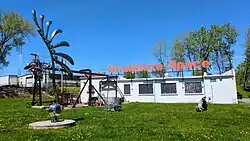 Sculpture installations have been made in spaces the building, on the grounds outside, and around the city of Utica.[5][6][7][1] In 1998, Sculpture Space purchased an adjacent abandoned house. It was intended to be used as additional studio and office space, and would eventually become artist housing, but first was host to a steel and wood installation penetrating the exterior walls of the building, as if "an alien form that had fallen into the house." Out of concern for the neighbors, the artist also planted cosmos in the front yard.[8] In 2001, to commemorate Sculpture Space's 25th anniversary, it invited five former residents to return to Utica. Their installations were set up outside City Hall, inside Union Station, and elsewhere throughout the city.[9] A 2012 performance/installation incorporated a saxophone player that a sculptor had met at a local coffeehouse.[10] Starting in 2008, Sculpture Space artists created the sculpture garden on the former Griffiss Air Force Base in nearby Rome, New York.[11][12][13]