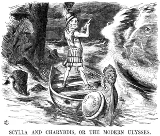 A later Punch caricature by John Tenniel, dated 10 October 1863, pictures the prime minister Lord Palmerston carefully steering the British ship of state between the perils of Scylla, a craggy rock in the form of a grim-visaged Abraham Lincoln, and Charybdis, a whirlpool which foams and froths into a likeness of Jefferson Davis. A shield emblazoned "Neutrality" hangs on the ship's thwarts, referring to how Palmerston tried to maintain a strict impartiality towards both combatants in the American Civil War.[12] American satirical magazine Puck also used the myth in a caricature by F. Graetz, dated November 26, 1884, in which the unmarried president-elect Grover Cleveland rows desperately between snarling monsters captioned "Mother-in-law" and "Office Seekers".[13]