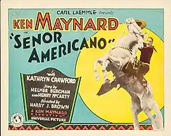 Señor Americano is a 1929 American sound part-talkie western film directed by Harry Joe Brown and starring Ken Maynard, Kathryn Crawford and Frank Beal.[1] While the film has a few talking sequences, the majority of the film featured a synchronized musical score with sound effects. It was distributed by Universal Pictures. Produced during the transition to sound, it was released in both sound and silent versions.