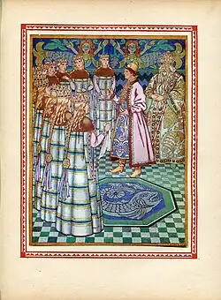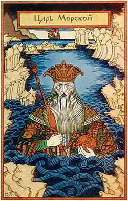 The Sea Tsar (Russian: Морской царь, sometimes inverted for emphasis: царь морской) is a character in East Slavic folktales and bylinas, the tsar of the sea realms. The best known examples are bylinas about Sadko and fairy tales about Vasilisa the Wise, such as The Sea Tsar and Vasilisa the Wise. Vsevolod Miller suggested that the image of the Sea Tsar was influenced by the Finnish god Ahti, known for the pomors (Russian seashore dwellers of the Russian North). Also Miller doubted that the image of Sea Tsar in these fairy tales reflects old East Slavic pagan beliefs and is probably based on the tales of itinerary storytellers. The Sea Tsar should not be confused with the water spirit, vodyanoy.[1]