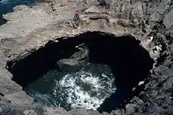 Sea caves can prove surprisingly complex where numerous zones of weakness—often faults—converge. In Catacombs Cave on Anacapa Island (California), at least six faults intersect.[11] In several caves of the Californian Channel Islands, long fissure passages open up into large chambers beyond. This is invariably associated with intersection of a second fault oriented almost perpendicularly to that along the entrance passage. When caves have multiple entrances, they are exposed to more wave action and hence may grow relatively faster. There is an exceptionally large cave underlying the Fogla Skerry, an islet off the coast of Papa Stour, in the Shetland Islands.[12] Though unsurveyed, estimates place it at almost 500 m of passage. Matainaka Cave in New Zealand has 12 separate entrances into which waves can penetrate and numerous joints along which intersecting passages have developed.