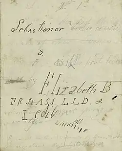 "Sebastian, or, Virtue Rewarded" is the name of an unpublished poem written around 1815 by the 9-year-old Elizabeth Barrett, later famous as Elizabeth Barrett Browning. The autographed manuscript of the poem is held in the Henry W. and Albert A. Berg Collection of English and American Literature in the New York Public Library. Note that the ambitious young Elizabeth signs herself F. R. S. (Fellow of the Royal Society) on the cover shown right.