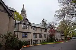There are gargoyles on either side of the front entrance. A square tower rises at the eastern end of the north elevation. To the north of the main building, the Parish House, an education wing with Tudor styling and leaded casement windows, was added in 1938.[2] The architectural firm Allen, Collens & Willis was responsible for the design.