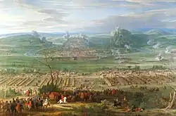In mid-April, Louis XIV targeted Besançon and the Bailliage du Milieu, avoiding Dole due to its resistance in 1636.[3] Besançon and Salins held most Comtois troops. Vauban advised attacking Besançon first, which Louvois approved.[24] From 25 April to 5 May, 15,000–20,000 French troops, led by the Duke of Enghien, besieged Besançon. Despite fierce resistance and sorties, minimal reinforcements arrived, and the city capitulated on 15 May, retaining its privileges as in 1668. Ornans and Pontarlier surrendered on 5 and 8 May, respectively.[25] On 26 May, Enghien besieged Dole, defended by 3,000 men under Sigismond d'Este, Marquis of Borgomanero.[26] After heavy bombardment and a breach on 6 June, Dole surrendered.[25]