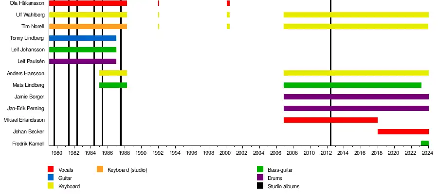 In 1979, Ola Håkansson, former vocalist of Ola & the Janglers and then a publishing manager at Sonet Records, teamed up with Tim Norell and Ulf Wahlberg as Ola+3 to perform at the 1979 Melodifestivalen, a contest which is the Swedish qualification to the Eurovision Song Contest. Ola+3 did not win but the members decided to continue working together and recorded an LP as Ola+3. Besides Ola Håkansson (vocals), Tim Norell and Ulf Wahlberg (keyboards), the original lineup also included Tonny Lindberg (guitars), Leif Paulsen (bass) and Leif Johansson (drums). Norell, who along with lyricist Björn Håkanson penned most songs of the band, did not however appear with them on stage or on the band photos.[2]