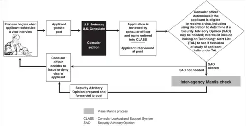 Security Advisory Opinion (SAO) or Washington Special Clearance,[1] commonly called security clearance, administrative clearance, or administrative processing,[2] is a process the United States Department of State and the diplomatic missions of the United States use in deciding to grant or deny a United States visa to certain visa applicants. The process involves sending a request from the visa issuing post to the Department of State's headquarters in Washington, D.C., to investigate an individual's case for possible espionage, terrorism, and illegal export of technology out of the United States.[3]