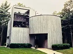 The house, the curtilage of which covers 3 acres, was built by John Caramagna in 1968 is surrounded by tall white pine trees and dogwoods. It is the first modernist beach residence[2] designed by the American architect Charles Gwathmey. After the 1100-square-feet house was built in 1968, the exterior combination with geometric shapes and blocks, plus its interior abundance use of glasses and steels with a stylish spiral staircase, made it stand out in a neighborhood dominated by shingle style Cape Cod houses. Sedacca House was frequently the background of wedding photos and appeared on the cover pages and articles of both American and other fashion and architecture magazines. In 1968, Sedacca House won the American Institute of Architects (AIA) New York Honor Award.[3] In Gwathmey's words, "[It] broke the mold of the vernacular, shingle-style house and showed for the first time a modern house that was not imitative or historicist.”[4] The Sedacca House has been sold a few times.[5] Still, it receives significant local concern about added alteration[6] and global attention[7][8] as a distinguished modernist architecture in East Hampton.