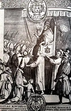 The earlier red-dressed papal grooms or palafrenieri were a different group of papal servants, originally liverymen for the papal carriage, then an influential confraternity, then finally merged with the sediari.[1] The sediari and parafrenieri constituted a confraternity from 1378, later the Arciconfraternita di Sant'Anna de Parafrenieri (Archconfraternity of Saint Anne of the Papal Grooms). Pius IV allowed them in 1565 to erect the chiesa di Sant'Anna dei Palafrenieri, designed by Jacopo Barozzi da Vignola.