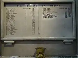 The following list of bishops is inscribed in St Mary's Cathedral, Kilkenny and was listed on the Catholic diocese's website.[3] Bishops in the early Irish church ruled over a kingdom, in this case, Osraige or Ossory, but were also often associated with a particular monastery and may have been in some matters subordinate to its abbot.