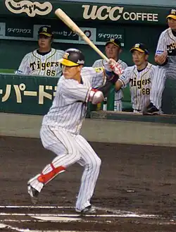 He joined the main team for spring training in Okinawa, and competed with Fumiya Hojoh and veteran Takashi Toritani for the shortstop position. On March 23, he broke the NPB record for most hits by a rookie in the pre-season exhibition games when he notched his 22nd hit.[8] This performance earned him the shortstop position and lead-off spot during the season opening card with the Yakult Swallows.[9] On March 29, he and fellow rookie Koji Chikamoto became the first pair of Hanshin rookies in 47 years to bat as lead-off hitters during the season opener.[10] But he eventually got removed from the line-up when he failed to produce a single hit. He notched his first career hit on April 12 as a pinch hitter against the Dragons, and a few days later, hit his first career home run with two runners on base against Tomoyuki Sugano.[11]