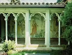 The frescoes at the entrance and courtyard were painted by Maxine Albro.[6]: 85, 165 There is a ceramic wreath by Andrea della Robbia in the entrance hall, which had been purchased for the house by Julia Morgan in Italy.[4]: 7 [6]: 164