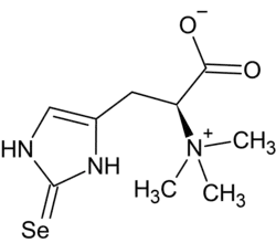Selenoneine is produced by microorganisms using enzymes that form a selenium-carbon bond.[7] Humans that eat fish have selenoneine in their blood. About half of selenium is in the form of selenoneine.[8] [9] Selenoneine inhibits angiotensin-converting enzyme.[10] In vertebrates, selenoneine is transported into cells using OCTN1.[4] Selenoneine reacts with methyl mercury to form a mercury tetraselenoate complex, which degrades to tiemannite, a mercury selenide. This is a mechanism used to detoxify mercury in marine vertebrates.[4] A related derivative, Se-methylselenoneine is found in lesser quantities in mackerel, sardine and tuna.[11]