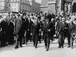 The proposal of the Social Democrats had 70 yes votes and 92 no votes and was therefore rejected. The proposal of the GDVP, however, was seemingly accepted with 81 yes votes and 80 no votes. At 8:40 pm the session was interrupted and then continued at 9:35 pm. After the session was resumed, the president and Chairman of the National Council, Social Democrat Karl Renner, announced that the vote had some irregularities because of the actions of two of his fellow Social Democrats, Wilhelm Scheibein and Simon Abram. It turned out that Abram cast one ballot for himself and another ballot, which carried Abram's name, for Scheibein, who was not in the room at the time when the voting process occurred. This resulted in an uproar and the Christian Socials demanded a new vote. Renner, who saw himself incapable of continuing the session, resigned as president of the National Council[3] to be able to participate in the ensuring vote and therefore secure an additional vote for the Social Democrats.[4] The second president Rudolf Ramek, a Christian Social, took over as chairman. He declared that the previous vote was invalid and demanded that the vote should be repeated. This resulted in another uproar. Ramek stepped down as president and the third president Sepp Straffner from the GDVP became Chairman of the National Council before immediately stepping down.[5] This left the National Council without a presiding officer. Without a presiding officer, the session could not be closed and the National Council was incapable of acting.[6] The Members left the chamber as consequence.[5]