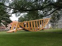 Seligenstadt's most prominent landmark and historic building is the Basilika St. Marcellinus und Petrus (also known colloquially as Einhard-Basilika) with Saints Marcellinus's and Peter's relics. Today's structure is mostly Baroque, dating to a reconstruction on occasion of its 900th anniversary, but the nave of the original three-aisled church built by Einhard is still extant. The massive crossing tower is Baroque, but the two Romanesque Revival towers flanking the western main entry only date to 1868. The interior is also dominated by Baroque features, such as the main altar, several altars in the transepts, the pulpit and the wrought-iron choir screen which replaced the medieval rood screen. The silver shrine containing the relics is today exhibited behind the choir screen. Above hangs a Romanesque crucifix.[3]: 15