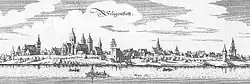 Seligenstadt had its first documentary mention on 11 January 815 in a donation document, under its then current name of Obermühlheim. The town was founded by Charlemagne’s biographer Einhard. After he had acquired the Frankish settlement of Obermulinheim from Louis the Pious in 815 as a donation, he founded a Benedictine monastery here. Mentioned as an earlier owner is a Count Drogo. The bones of the martyrs Marcellinus and Peter, which had been stolen in Rome, were transferred from the basilica in Steinbach in the Odenwald to Obermühlheim, soon leading to a change in the community’s name from Obermühlheim to Seligenstadt ("town of the blessed ones" in German). About 830, building work began on the Einhard-Basilika, the current version of which is now the landmark of Seligenstadt. Einhard died in 840 and he and his partner, Imma, are buried in a chapel in the northern transept of the church.[3]: 14