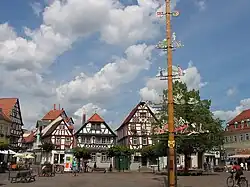 Most of these two- and three-floor timber-frame houses are to be found at the marketplace and in rows along the nearby streets (particularly Steinheimer Straße, Kleine Fischergasse, Große Fischergasse, Kleine Maingasse, Große Maingasse and Freihofstraße). Examples at the marketplace are the Alte Schmiede (“Old Smithy”, no. 13, now a restaurant), nos. 7 and 10, the historic apothecary with the apothecary's emblem with a mortar, the so-called Einhard-Haus from 1596 with a richly decorated oriel, the house on Steinheimer Straße at the corner of Stadtmühlengasse (1697), Freihofplatz 3 (1567), the little house at Freihofstraße 4 and many others.