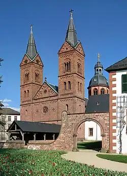 Nothing remains of the original Benedictine abbey built in the 9th century. The oldest extant buildings of Kloster Seligenstadt date from the 11th century. The most prominent are from the Baroque period, including the library and the Prälatur with its Kaisersaal (emperor's hall). The abbey was dissolved in 1803.[3]: 15