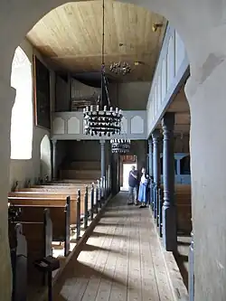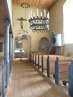 The earliest existing historical records of the church date back to the year 1319, but that is not when the church was built. The stone church was built around the year 1180, although construction likely started earlier, possibly as early as 1150. The church has a rectangular nave and chancel with a small tower on the roof of the nave. The chancel has a semi-circular apse on the east end. Around 1630, the church was struck by lightning and it caught fire. Afterwards, the church was rebuilt after the extensive damage from the fire. A new wooden church porch was built on the west end after the fire.[4][5]