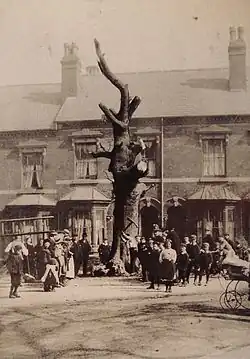 The oak that stood there was finally felled in May 1909 amid fears about its safety, due to damage to its roots caused by the building of the nearby houses. The tree was cut-up and the stump removed to Selly Oak Park, where it remains to this day, bearing a brass plaque that reads "Butt of Old Oak Tree from which the name of Selly Oak was derived. Removed from Oak Tree Lane, Selly Oak 1909".[58] By 2011 the stump had become quite rotten and the brass plaque was no longer secure. It was removed by the Friends of Selly Oak Park and replaced with a replica plaque. The original was retained by the Friends for conservation. The remains of the stump were left in the park.