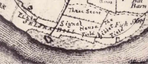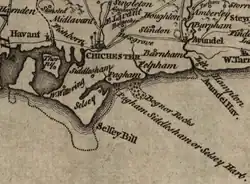 Henry VI granted that lands of Chichester Cathedral should be exempt from the Court of the Admiralty in the manner of wrecks, which meant in effect that any wrecks off Selsey Bill would be the bishop's property.[7] In the 18th century, members of a notorious smuggling gang were captured and tried for the brutal murder of a supposed informant and a customs official, Chater and Galley.[10] Seven were condemned to death at the assizes held at Chichester in 1749 and, after they had been executed at the Broyle, Chichester, two of them were subsequently hung in chains at Selsey Bill, a Yeakel and Gardner map has a Gibbet Field marked on it where it is believed the smugglers hung.[10]