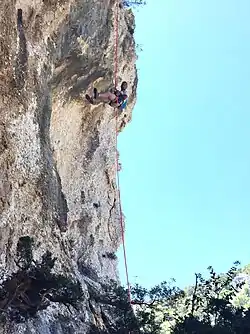The last day starts from Bacu Su Feliau and ends 7 km later in Cala Sisine (40°10'45"N 9°38'1"E). It offers a large variety of scenery, the highest altitude reached during this stage is 480 m. The estimated travel time is 6.5 hours and the technical difficulty is ranked IV on the UIAA scale. This makes this stage the second most difficult of the Selvaggio Blu.[4] At the start of this stage, it is necessary to climb a juniper trunk with giant moss-covered oaks. The route then traverses a gully and is then marked with blue waymarks painted on rocks. These mark the way to exit the woods, utilizing ancient mule tracks, and gives a panoramic view of the sea. Before descending, there is the possibility to climb a cliff named "rottura delle altezze" (which means "breaking the heights") from which walkers can look at the sea 200 m below. One of the paths leads to the ovule Piddi, meaning Mandragora or Mandrake in Sards; this poisonous plant grows all over the Supramonte. Helped by the locals, Verin and Cicalò built a network of mule tracks that, with a series of bends, pass through the most impervious gullies and lead to the sea, which can be seen only in Cala Sisine; here there are docks built to transport charcoal and woods.[1] From Cala Sisine it is possible to return to the starting point by the sea with an inflatable boat or by land with a SUV.