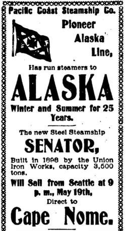 - ^ "Steamer Senator on the Way to the Famous Nome". San Francisco Examiner. May 15, 1900.