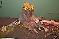 • A vivarium with 70 living animal species from the rainforests and native regions in 12 elaborately designed landscape basins on an area of 100 m2[3] completes the other permanent exhibitions. Visitors are offered regular show feedings. Rarities such as the black freshwater stingray from Brazil, Madagascan tomato frogs or the Senegal flounderfish, a "living fossil", can be seen. But also native species like grass snake or the eurasian harvest mouse are represented.