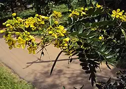 It is a medium-size, evergreen tree growing up to 18 m (60 ft) with yellow flowers. Leaves are alternate, pinnately compound, with slender, green-reddish, tinged axis and 6 to 12 pairs of leaflets on short stalks, rounded at both ends.