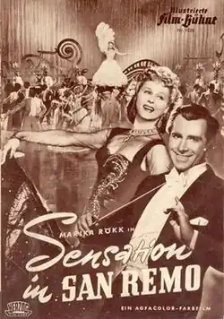 Sensation in San Remo is a 1951 West German musical comedy film directed by Georg Jacoby and starring Marika Rökk, Peter Pasetti and Ewald Balser. It was one of Rökk's most successful post-war films.[1] The film is partly set at the Sanremo Festival in Italy. It was shot at the Bendestorf Studios with location shooting taking place on the Italian Riviera in the vicinity of Sanremo. It was made in Agfacolor. The film's sets were designed by the art director Erich Kettelhut.