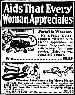 A solution was the invention of massage devices, which shortened the needed treatment from hours to minutes, removing the need for midwives and increasing a physician's treatment capacity. Already at the turn of the century, hydrotherapy devices were available at Bath, and by the mid-19th century, they were popular at many high-profile bathing resorts across Europe and in America. By 1870, a clockwork-driven vibrator was available for physicians. In 1873, the first electromechanical vibrator was used at an asylum in France for the treatment of hysteria. While physicians of the period acknowledged that the disorder stemmed from sexual dissatisfaction, they seemed unaware of or unwilling to admit the sexual purposes of the devices used to treat it. In fact, the introduction of the speculum was far more controversial than that of the vibrator. By the turn of the 20th century, the spread of home electricity brought the vibrator to the consumer market. The appeal of cheaper treatment in the privacy of one's own home understandably made the vibrator a popular early home appliance. In fact, the electric home vibrator was on the market before many other home appliance "essentials": nine years before the electric vacuum cleaner and 10 years before the electric iron. A page from a Sears catalog of home electrical appliances from 1918 includes a portable vibrator with attachments, billed as "very useful and satisfactory for home service".[6]