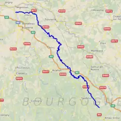 The Serein rises in the Auxois hills at Arconcey and flows north-north-west into the Yonne at Bassou. Both the A6 Autoroute du Soleil and the Paris-Lyon railway line follow a similar route through the area.