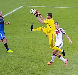 Romero was Argentina's starting goalkeeper at the 2014 FIFA World Cup despite lack of first team opportunities whilst at Monaco.[112][113] In the semi-final, he earned himself Man of the Match[114] by saving kicks from Ron Vlaar and Wesley Sneijder as Argentina defeated the Netherlands 4–2 in a penalty shoot-out to reach the 2014 FIFA World Cup Final on 13 July, where they lost 0–1 to Germany.[115] On 11 July 2014, Romero was named on the three-man shortlist for FIFA's Golden Glove award for the tournament's best goalkeeper due to his performances that led his team to the final.[116]